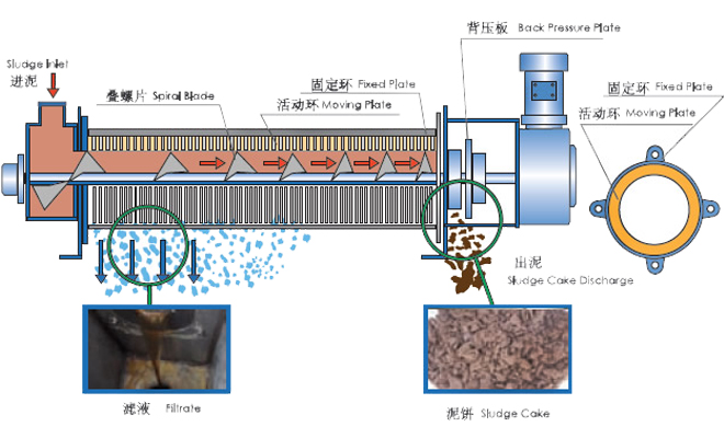 設(shè)備運行時,污泥從進(jìn)料口進(jìn)入濾筒后受到螺旋葉片的推送向卸料口移動,由于螺旋軸葉的螺距逐漸縮小,因此污泥所受到的壓力也隨之不斷增加,并在壓力的作用下開始脫水,水從固定環(huán)與游動環(huán)的間隙流出,同時設(shè)備依靠固定環(huán)也游動環(huán)之間的自清洗功能,清掃過濾間隙不易堵塞,泥餅經(jīng)過脫水后在螺旋軸的推進(jìn)作用下從卸料口排出。